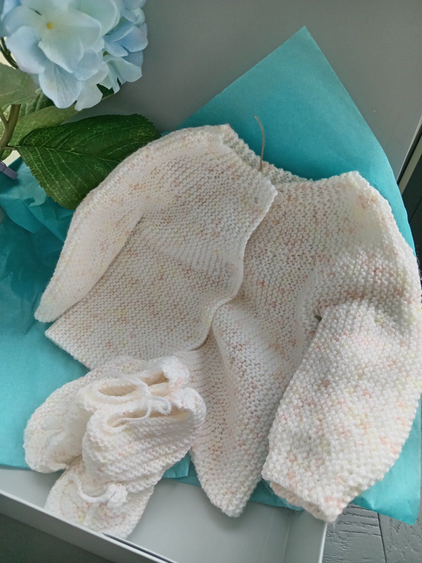 Brassière et chaussons en laine acrylique pour bébé, fait main au tricot, entièrement artisanal.