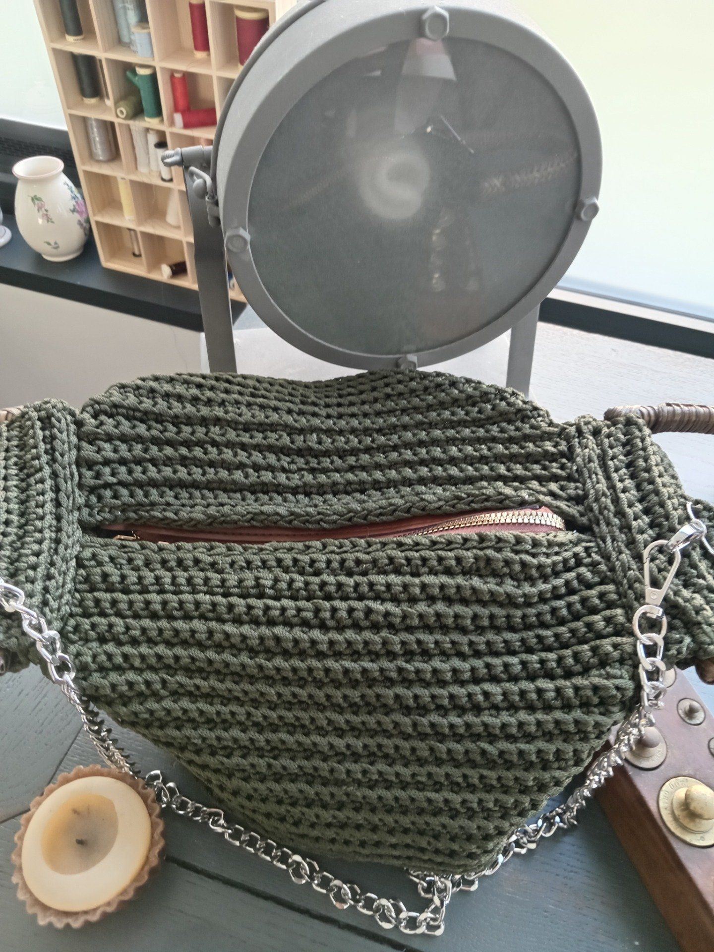 Sac vert Kaki forme originale, fait main au crochet, en fil coton 100 % polypropylène.
